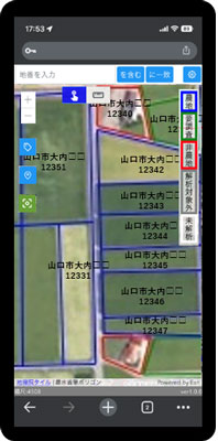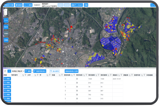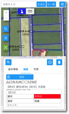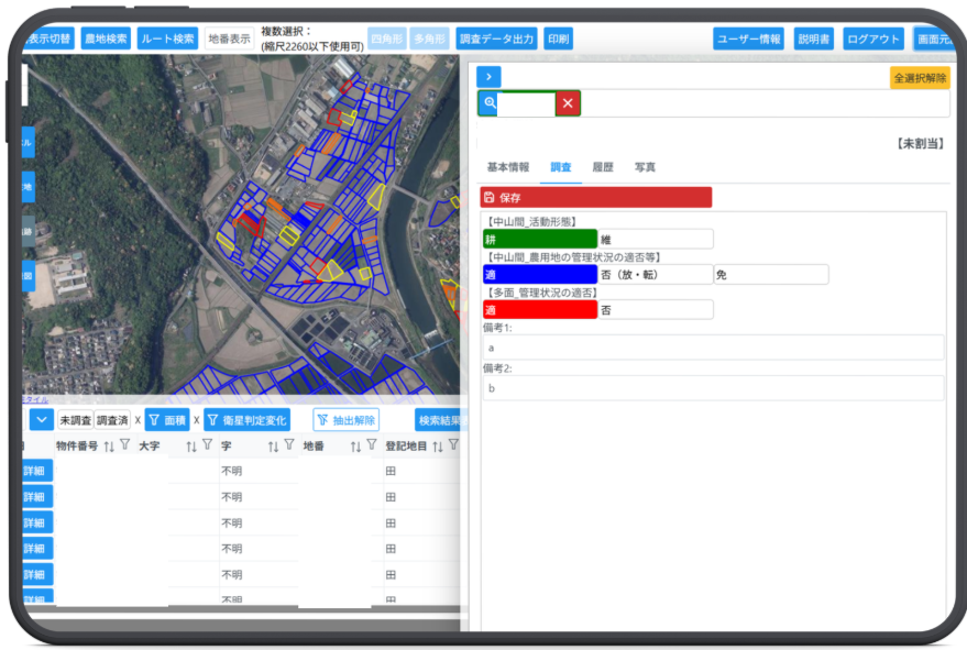 地図機能を備えており、タブレット等で現地確認対象の農地位置を地図上へ表示する事ができ、地図上で農地の地番、調査圃場、調査結果、位置を現地にて直接タブレットに登録・確認する事ができます。